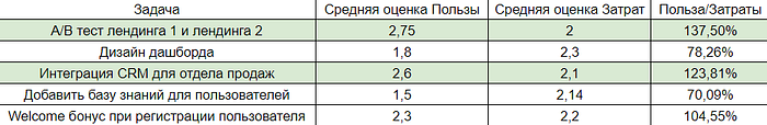 - 製品マネージャーとチームは、各機能の利点について話し合い、1から3までのグレードを付けます。ここで、3は「非常に便利」、1は「最小限」です。平均値が表に記録されます。